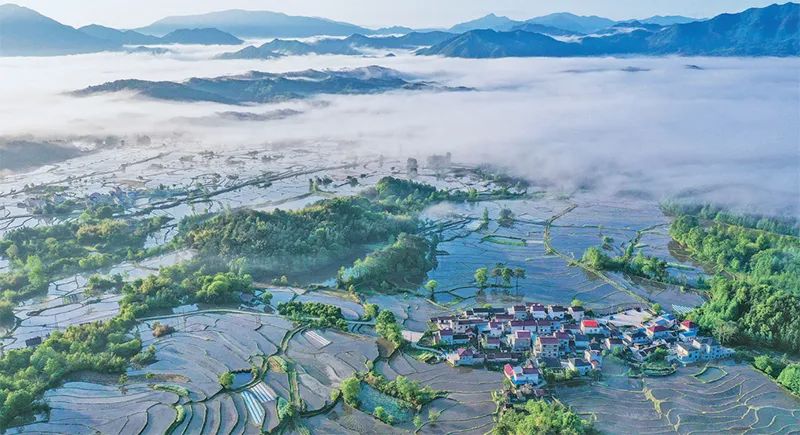 图为2022年4月24日,安徽省宣城市旌德县兴隆镇三山村的万亩梯田已经蓄水耕种,朝霞映照形状各异的梯田,云雾轻拂散落田间的村庄,构成了一幅美丽的乡村画卷。 安徽日报社供图 江建兴/摄