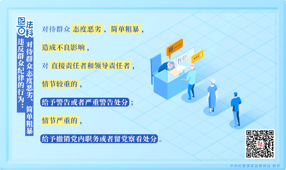《中国共产党纪律处分条例》第一百二十六条规定,对待群众态度恶劣、简单粗暴,造成不良影响,对直接责任者和领导责任者,情节较重的,给予警告或者严重警告处分;情节严重的,给予撤销党内职务或者留党察看处分。