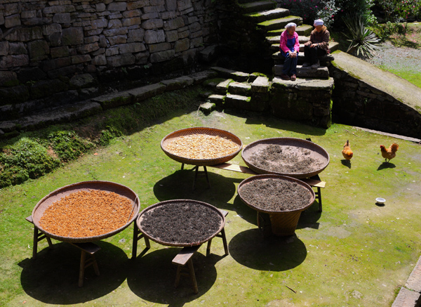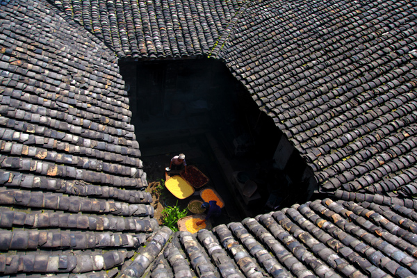 初夏,青色的瓦片留出一眼天井,透过天井,老夫妇俩晒出了大豆、辣椒、绿豆等。