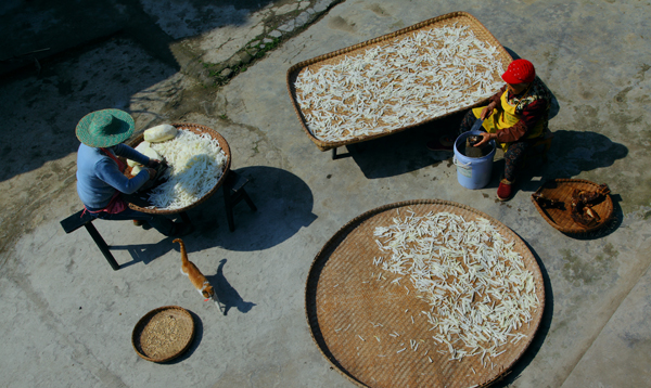 春天,萝卜、腊肉等美食需要预存。母女俩把切好的萝卜丝拿出来晾晒,既晒美味又晒出亲情。
