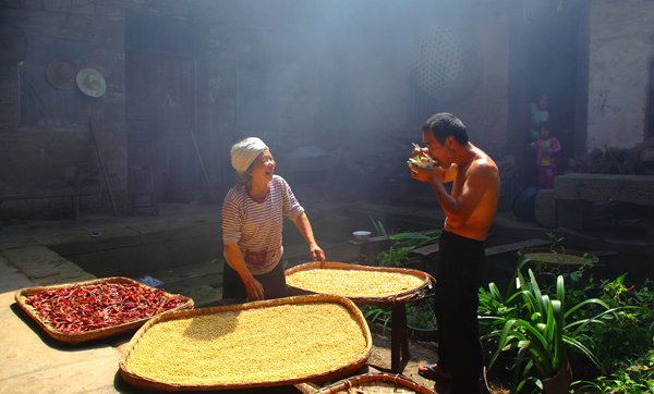 天井虽然是个小晒场,爽朗的笑声却能体现母子情深和收货的喜悦。儿子憨厚的吃相把农家山村的欢乐塞满了天井。