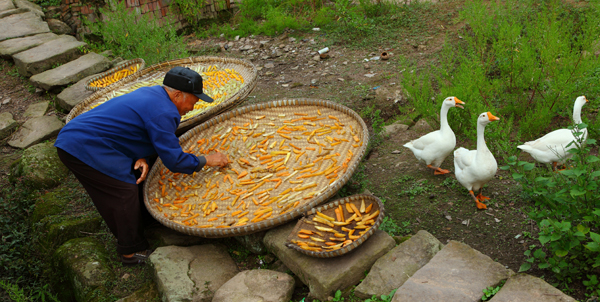 初冬,宁静的小山村里只有鸡、鸭、鹅宣嚣的叫声,长长的青石板路上晒出了红苕干,也透露着空巢老人与鹅为伴的那份孤独与牵挂,盼着在外的儿女早日归乡。