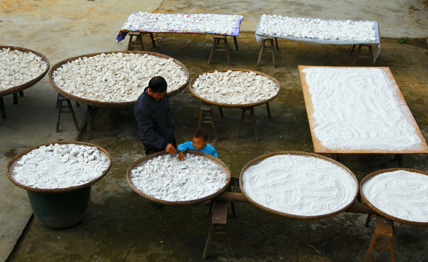 父子俩把红苕弄碎沉淀制作成红苕粉,晒干后可成就苕皮回锅肉等美食。