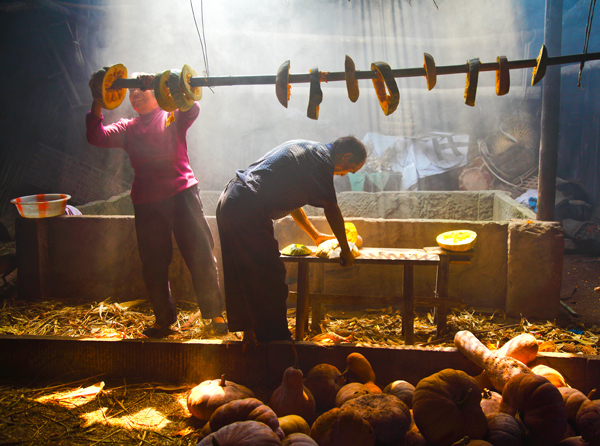 一对夫妻抓住阳光天气晒南瓜,红黄的南瓜瓤映红了夫妻的脸,妻子脸上已挂满了幸福的微笑。