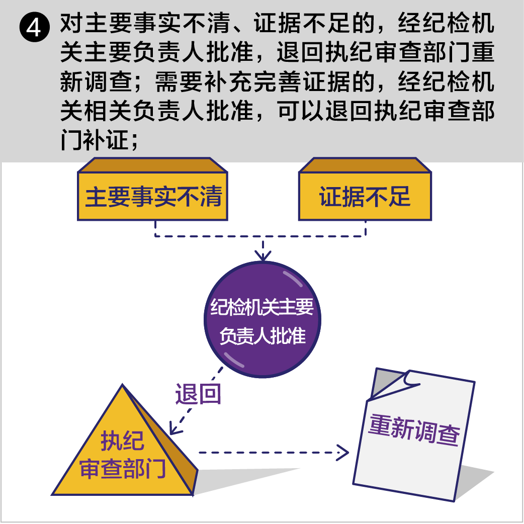 (四)对主要事实不清、证据不足的,经纪检机关主要负责人批准,退回执纪审查部门重新调查;需要补充完善证据的,经纪检机关相关负责人批准,可以退回执纪审查部门补证。