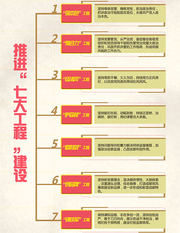 在今年召开的成都市第十三次党代会上,成都市纪委向党代会的报告对未来五年党风廉政建设和反腐败工作作了系统部署,提出了建设“葆本色”“聚合力”“扬清风”“护森林”“磨利剑”“创品牌”“铸铁军”等“七大工程”的总体安排。