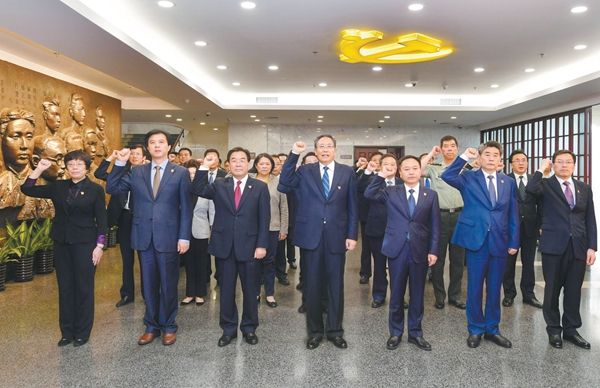 中共一大会址位于上海市兴业路76号。1921年7月,中国共产党第一次全国代表大会在这里举行,宣告了中国共产党成立。省委常委首先来到宣誓厅,面对鲜艳的中国共产党党旗,一起重温入党誓词。在李锦斌领誓下,省领导们举起右拳,郑重宣誓:“我志愿加入中国共产党,拥护党的纲领,遵守党的章程,履行党员义务,执行党的决定,严守党的纪律,保守党的秘密,对党忠诚,积极工作,为共产主义奋斗终身,随时准备为党和人民牺牲一切,永不叛党”。铿锵有力的宣誓声响彻大厅,表达了安徽省委坚定不移听党话、跟党走的政治信念。