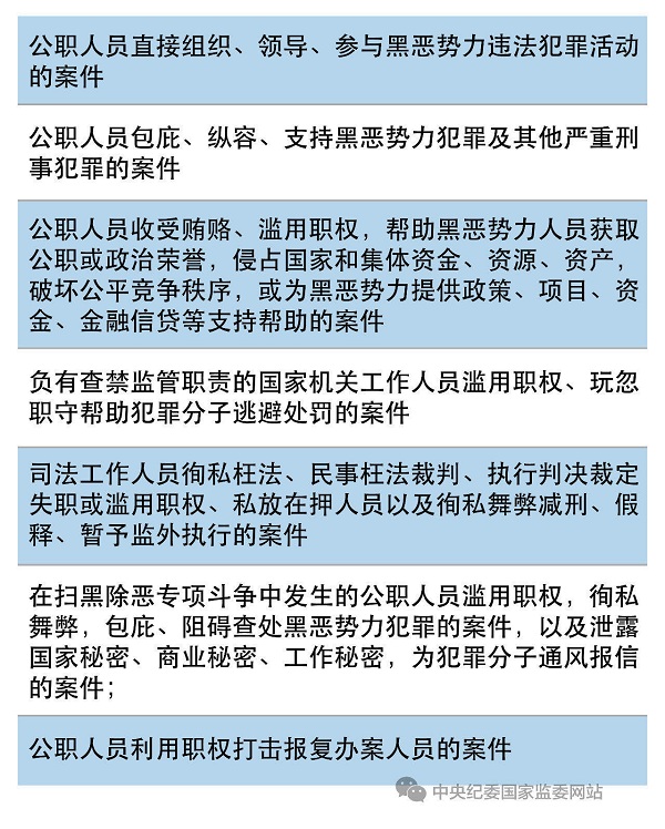 4.各级监察机关、人民法院、人民检察院、公安机关应聚焦黑恶势力违法犯罪案件及坐大成势的过程,严格查办公职人员涉黑涉恶违法犯罪案件。重点查办以下案件:公职人员直接组织、领导、参与黑恶势力违法犯罪活动的案件;公职人员包庇、纵容、支持黑恶势力犯罪及其他严重刑事犯罪的案件;公职人员收受贿赂、滥用职权,帮助黑恶势力人员获取公职或政治荣誉,侵占国家和集体资金、资源、资产,破坏公平竞争秩序,或为黑恶势力提供政策、项目、资金、金融信贷等支持帮助的案件;负有查禁监管职责的国家机关工作人员滥用职权、玩忽职守帮助犯罪分子逃避处罚的案件;司法工作人员徇私枉法、民事枉法裁判、执行判决裁定失职或滥用职权、私放在押人员以及徇私舞弊减刑、假释、暂予监外执行的案件;在扫黑除恶专项斗争中发生的公职人员滥用职权,徇私舞弊,包庇、阻碍查处黑恶势力犯罪的案件,以及泄露国家秘密、商业秘密、工作秘密,为犯罪分子通风报信的案件;公职人员利用职权打击报复办案人员的案件。
