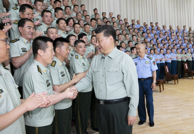 8月22日,中共中央总书记、国家主席、中央军委主席习近平到空军某基地视察。这是习近平亲切接见驻甘肃部队副师职以上领导干部和团级单位主官。 新华社记者 李刚 摄