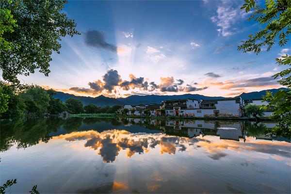 古村的夕阳西下,霞光初现。(安徽省黟县纪委监委 崔健 摄)