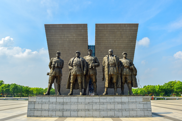 渡江战役总前委群雕为全铜铸制,从左往右分别为粟裕、邓小平、刘伯承、陈毅和谭震林五位总前委成员,表现出五位领导人运筹帷幄,决胜千里,指挥百万雄师横渡长江天堑的雄才大略与宏伟气度。