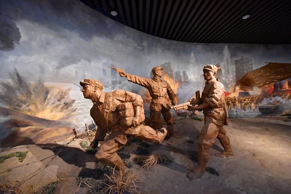 雕塑“抢滩登陆”刻画了中国人民解放军胜利渡过长江,向国民党军阵地冲锋的画面。