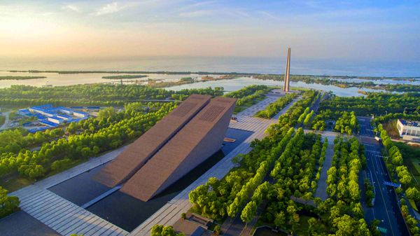 渡江战役纪念馆体现的是水与战舰的主题,巨大的馆身犹如两艘雄伟战舰并排行驶在浩翰的水面,向前直指南方的长江,造型彰显了我军战船乘风破浪的飒爽英姿。