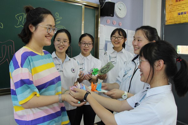 杭州市拱墅区长阳中学初三毕业班的同学回到学校看望老师,并送上自己制作的贺卡、纸鹤、纸花等礼物。(杭州市纪委监委 王乃召 摄)