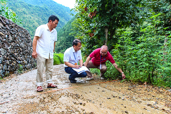 浙江省开化县纪委监委派出核查组,对群众反映的村庄机耕路工程量不达标问题进行实地测量。(浙江省开化县纪委监委 吴佳徽 摄)
