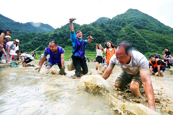 “盐马古道”民俗风情活动让游客们亲身体验现场摸鱼的惊险与刺激。(重庆市丰都县纪委监委供 高志相 摄)