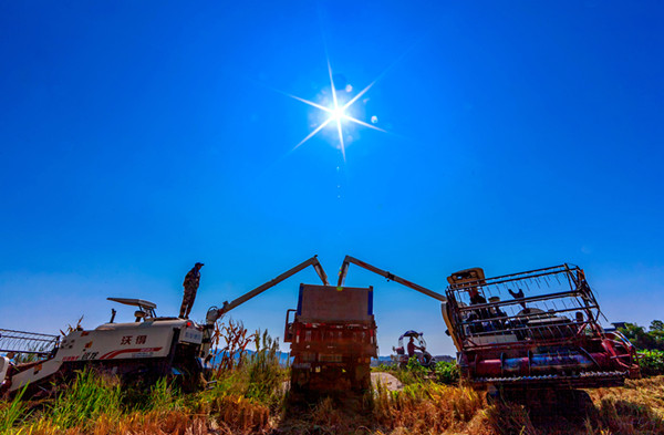 西南地区广袤田野里,农民们将收获的稻谷装入卡车,一派丰收景象。(四川省彭州市纪委监委供 颜晓红 摄)
