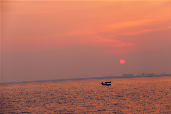 夕阳的余辉洒向大海,天空、海面、船只都被镀上了一层金黄的色彩。(海南省乐东黎族自治县纪委监委供 吉其荣 摄)