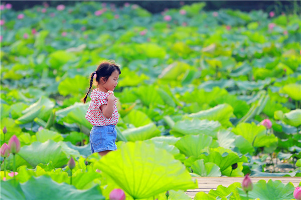 初秋时节,小女孩穿梭于片片荷叶间,恍如人在画中。(江西省宜黄县纪委监委供 周文静 摄)