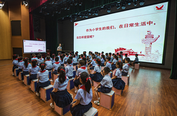 8月30日,四川省泸州市泸师附小城西学校组织开展题为《我和我的祖国》开学第一课。活动通过歌唱祖国、学习历史、为祖国送祝福等形式,开展爱国主义教育,增强学生的爱国意识。(四川省泸州市江阳区纪委监委供 易路勇 摄)