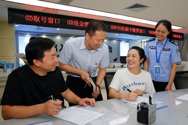 湖北省宜昌市纪委监委驻市公安局纪检监察组在市公安局出入境管理窗口检查国家移民管理局“只跑一次”制度落实情况。(湖北省宜昌市纪委监委 唐强 摄)