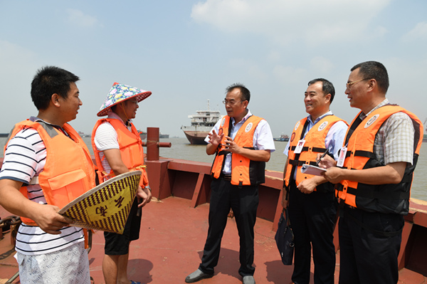 江苏省泰兴市纪委监委第十三派驻纪检监察组走访长江运输船船主,摸排市水政执法人员在执法过程中是否存在借机吃拿卡要等问题。(江苏省泰兴市纪委监委 单志宏 摄)