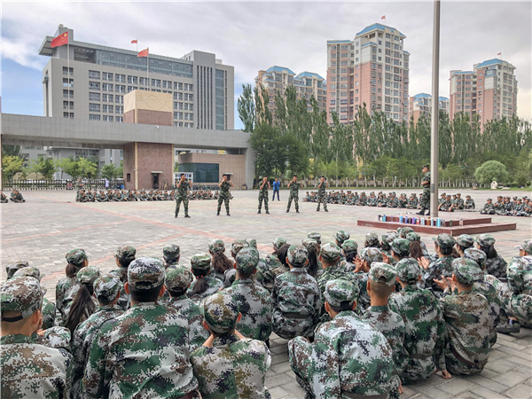新疆维吾尔自治区阿克苏地区拜城县开展新学期新生军训,让学生们体验部队生活,掌握必要的国防知识,进一步增强学生的国防意识,激发爱国热情。(新疆维吾尔自治区拜城县纪委监委供 马晓燕 摄)