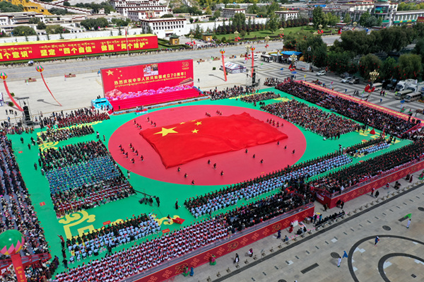 9月29日,西藏自治区庆祝中华人民共和国成立70周年群众联欢活动在拉萨市布达拉宫广场举行。图为群众联欢活动现场。(西藏自治区纪委监委供 西纪轩 摄)