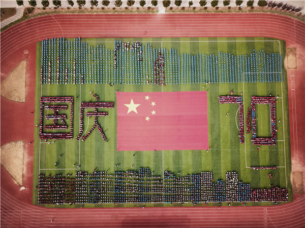 安徽省宿州市国际实验小学举行“迎国庆70周年”系列活动,全校师生通过整齐列队,摆出“国庆”“70”等造型,喜迎中华人民共和国成立70周年。(安徽省宿州市埇桥区纪委监委供 邵子卿 摄)