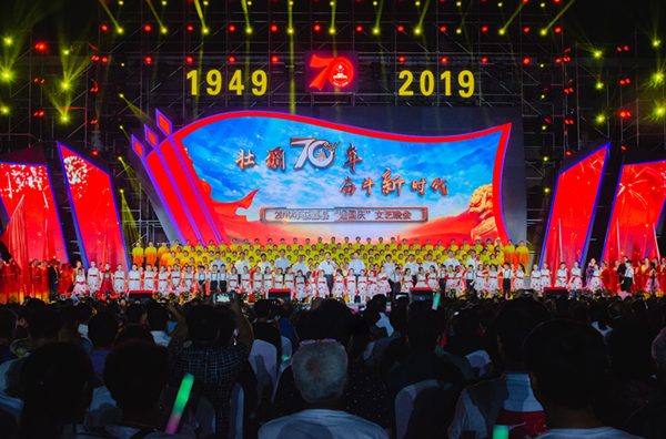 唱响赞歌颂祖国。庆祝新中国成立70周年之际,河南省获嘉县举办“壮丽70年 奋斗新时代”迎国庆文艺晚会,一千多名来自基层的干部群众和文艺演员载歌载舞,表达对祖国的深切祝福。(河南省获嘉县纪委监委供 郭爱民 摄)