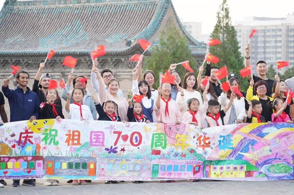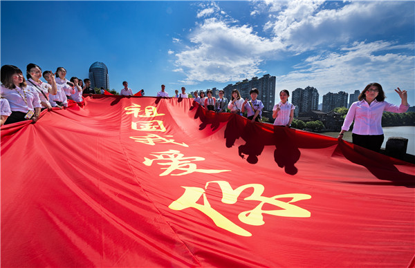 杭州市拱墅区党员干部、纪检干部和社区工作者在京杭大运河最南端的拱宸桥上拉开巨幅“祖国我爱你”红旗,齐声欢呼为祖国母亲庆生,在蓝天白云下增添一抹节日的亮色!(杭州市拱墅区纪委监委供 杨志坚 摄)
