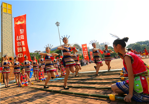为庆祝中华人民共和国成立70周年,海南省举办万人共跳竹竿舞活动。琼中市黎族苗族阿哥阿妹们穿上节日的盛装,在广场上载歌载舞,共迎祖国70周年华诞。(海南省琼海市纪委监委供 林学健 摄)