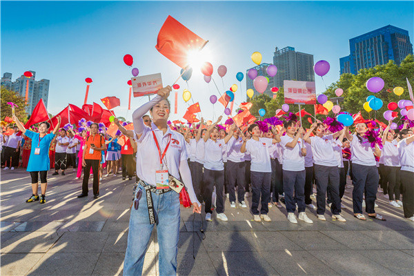 国庆前夕,江西省萍乡市各界近万人在秋收起义广场举行盛大的向人民英雄敬献花篮仪式暨同唱“我和我的祖国”、同诵“可爱的中国”、同贺“新中国成立70周年”庆祝活动,震撼唱响礼赞新中国、奋进新时代的最强音。(江西省萍乡市纪委监委供 姚茜 摄)