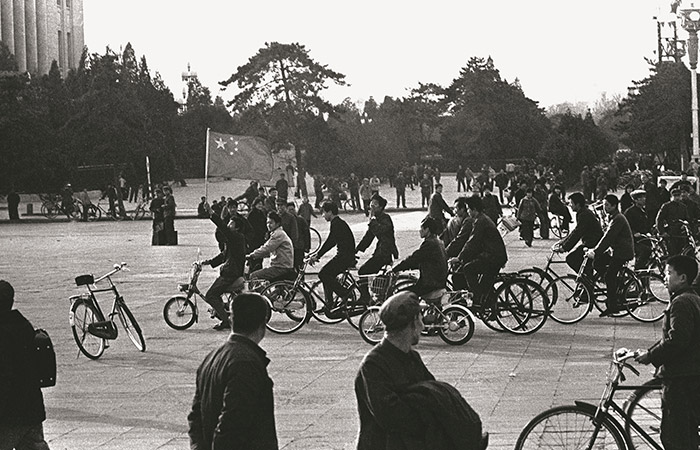 1985年,中国女排夺得“四连冠”时,北京市民在天安门广场上挥舞国旗,表达激动的心情。(翁乃强 摄)