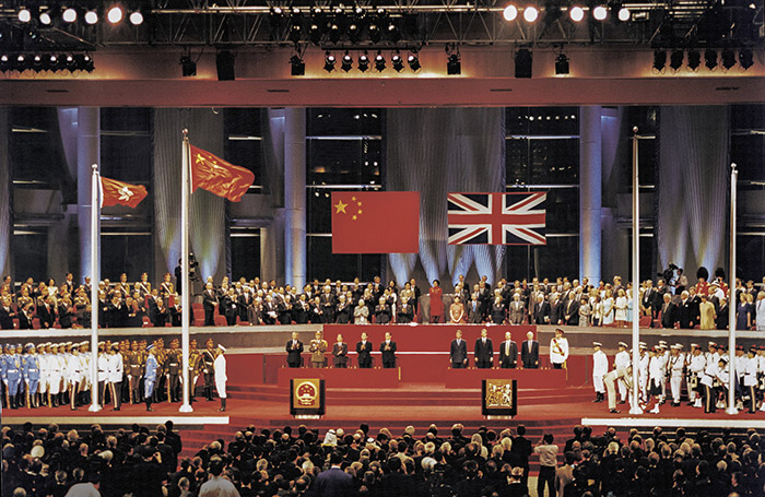 1997年7月1日,香港政权交接典礼上,中国国旗升旗仪式的现场。(王苗 摄)
