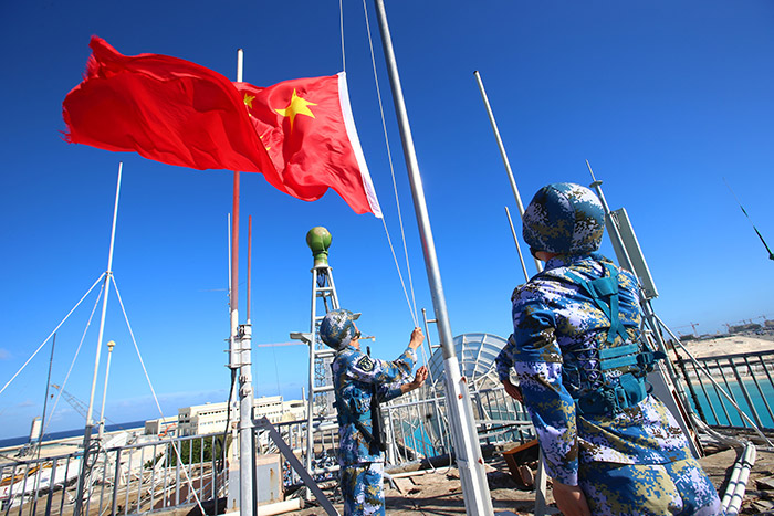 2016年1月5日,驻守在南沙群岛永暑礁上的海军官兵正在举行升旗仪式。(新华社记者 查春明 摄)