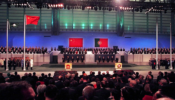 1999年12月20日,中华人民共和国国旗和中华人民共和国澳门特别行政区区旗在澳门文化中心花园馆升起。