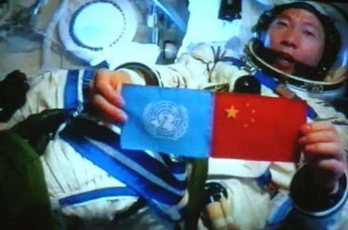 2003年10月15日,杨利伟在“神舟5号”飞船上展示五星红旗。这是中华人民共和国国旗第一次出现在太空。