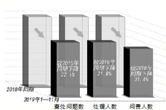 图①:2019年1月至11月,全国查处群众身边腐败和作风问题数、处理人数、问责人数与上年同期相比均有下降。