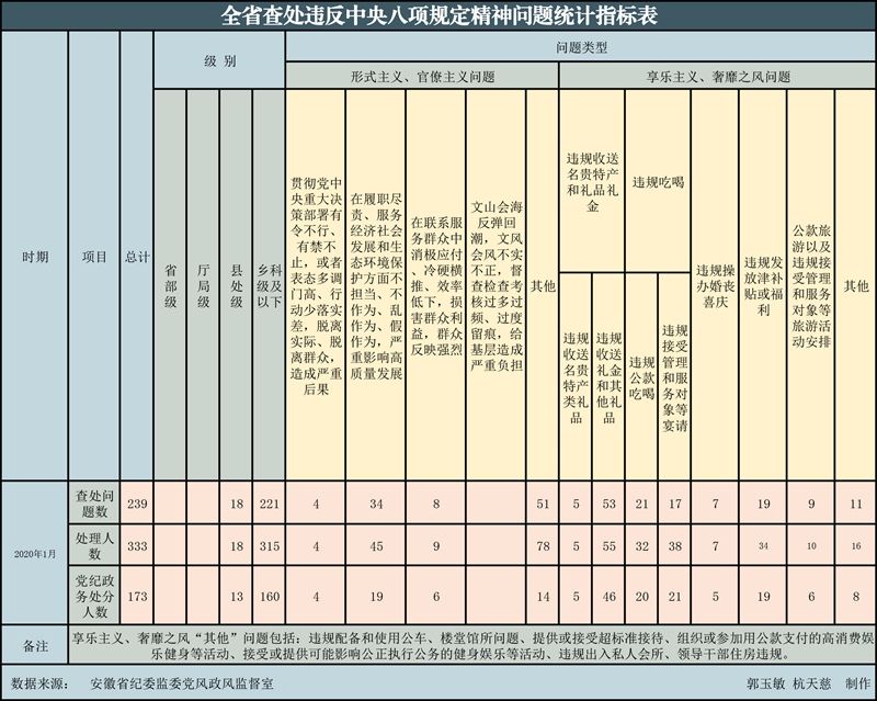 为掌握全省贯彻落实中央八项规定精神情况,安徽省纪委监委在各省辖市和各省直机关、各省属高校、各省属企业建立了落实中央八项规定精神情况月报制度。2020年以来,截至1月31日,全省查处违反中央八项规定精神问题情况如下: