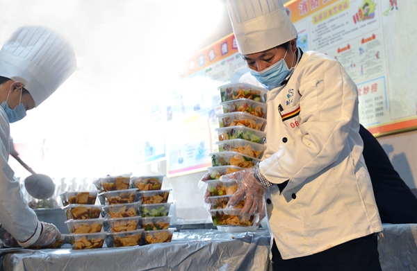 江西省乐平市的一家餐饮公司自发成立爱心盒饭小团队,厨师与员工们每天对热菜热饭进行制作、分装、打包,为疫情防控一线的人们送去免费“爱心工作餐”,用爱心温暖一线人员。(江西省乐平市纪委监委供 徐天泽 摄)