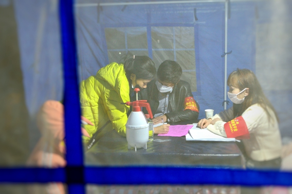 浙江省开化县的党员志愿者日夜坚守在疫情检测点上进行摸排、登记、宣传、劝导。气温骤降,但微光暖人,他们用实际行动守护群众安康。(浙江省开化县纪委监委供 汪新华 摄)