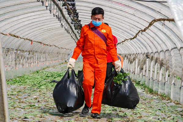 云南省曲靖市麒麟区菜农李章会在“爱在珠江源”志愿者协会60余名志愿者的帮助下,收割不同种类蔬菜40余吨,全部免费赠送给市区20多家医院和疫情防控相关单位。(云南省曲靖市纪委监委供 李雪松 摄)