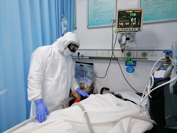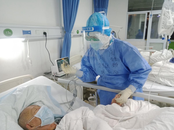 协和武汉红十字会医院急诊科副主任吕希俊正在与重症新冠肺炎患者交流,进行心理安慰,鼓励病人增强信心,早日康复。(武汉市江汉区纪委监委供 邱琼 摄)
