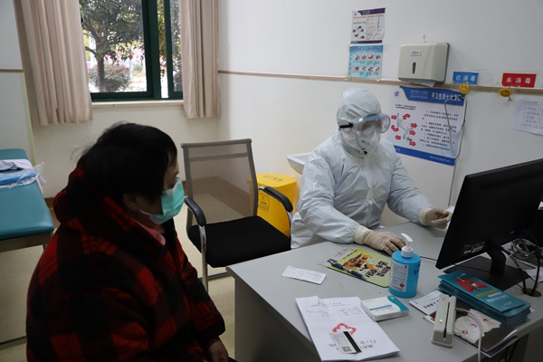 湖北省枣阳市退休医生王吉敏曾参加过2003年非典防控工作,大年三十她向医院党委递交请战书,要求到诊疗一线工作。图为她正在门诊为患者诊断。(湖北省枣阳市纪委监委供 马国伟 摄)