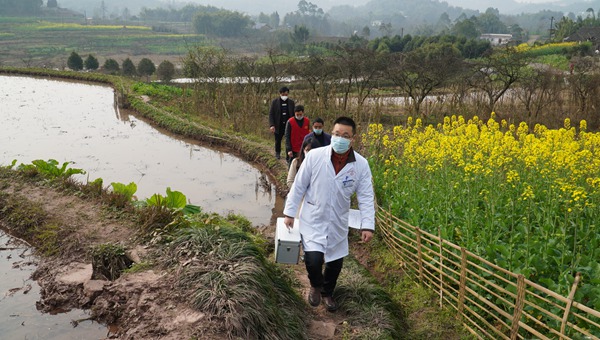四川省犍为县寿保镇卫生院医护人员充分发挥党员干部模范作用,坚持定期到19户居家隔离的村民家中开展疫情防控,守住乡村战“疫”底线。(四川省犍为县纪委监委供 傅维军 摄)