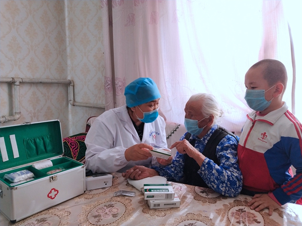 为守护熟悉的村庄和朴实的村民,新疆维吾尔自治区阿勒泰市汗德尕特乡阿尔恰特村村医巴特德力格尔·巴依开每天身穿白大褂、肩挎出诊箱、佩戴口罩,不畏风雪严寒、起早摸黑奔波在第一线,通过建立群众健康台账、宣传疫情防护知识、定期入户检查身体、心理疏导村民情绪等,用贴心服务的行动赢得了村民的信任和好评,村民亲切地称她为村里的健康“守护者”。图为巴特德力格尔为哈萨克族高血压患者白加马列·木汗检查身体。(新疆维吾尔自治区阿勒泰市纪委监委供 新泰轩 摄)