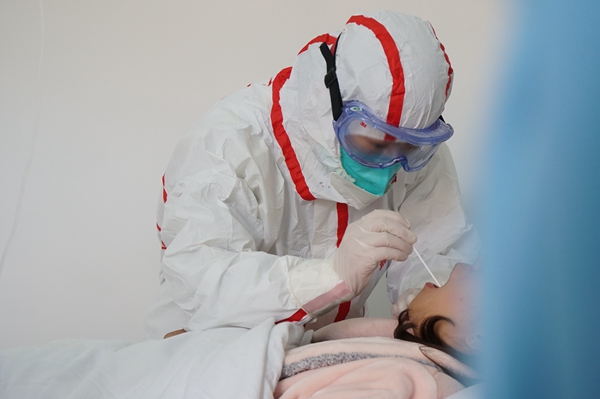 “啊,张嘴……”浙江省龙游县定点诊治医院隔离病房内,穿三层防护服、戴双层手套。“全副武装”的医护人员正在进行鼻咽拭子的采样。每个步,都得格外小心,因为在整个疫情防控工作中,这是距离病毒最近、最危险的时刻。(浙江省龙游县纪委监委供 童宏伟 摄)