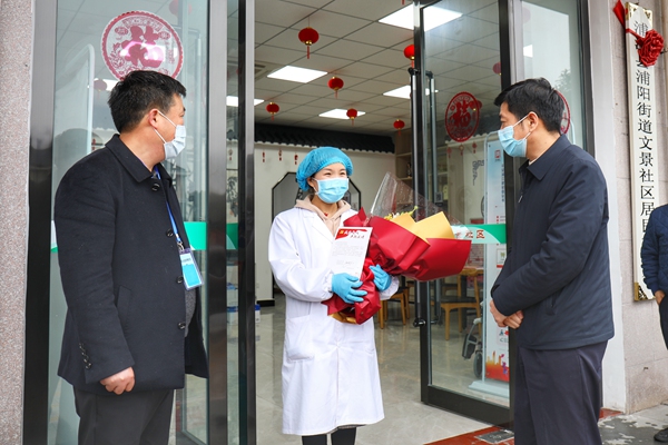 浙江省浦江县纪委监委为坚守在疫情医疗一线岗位上的纪检监察干部家属送去关怀和温暖,详细询问了解他们在工作和生活上的困难,并激励他们全力以赴打赢疫情防控阻击战。(浙江省浦江县纪委监委供 周伟灵 摄)