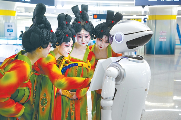 2021年3月18日,郑州,河南春晚《唐宫夜宴》演员“穿越”打卡地铁站,并与智能机器人互动交流。